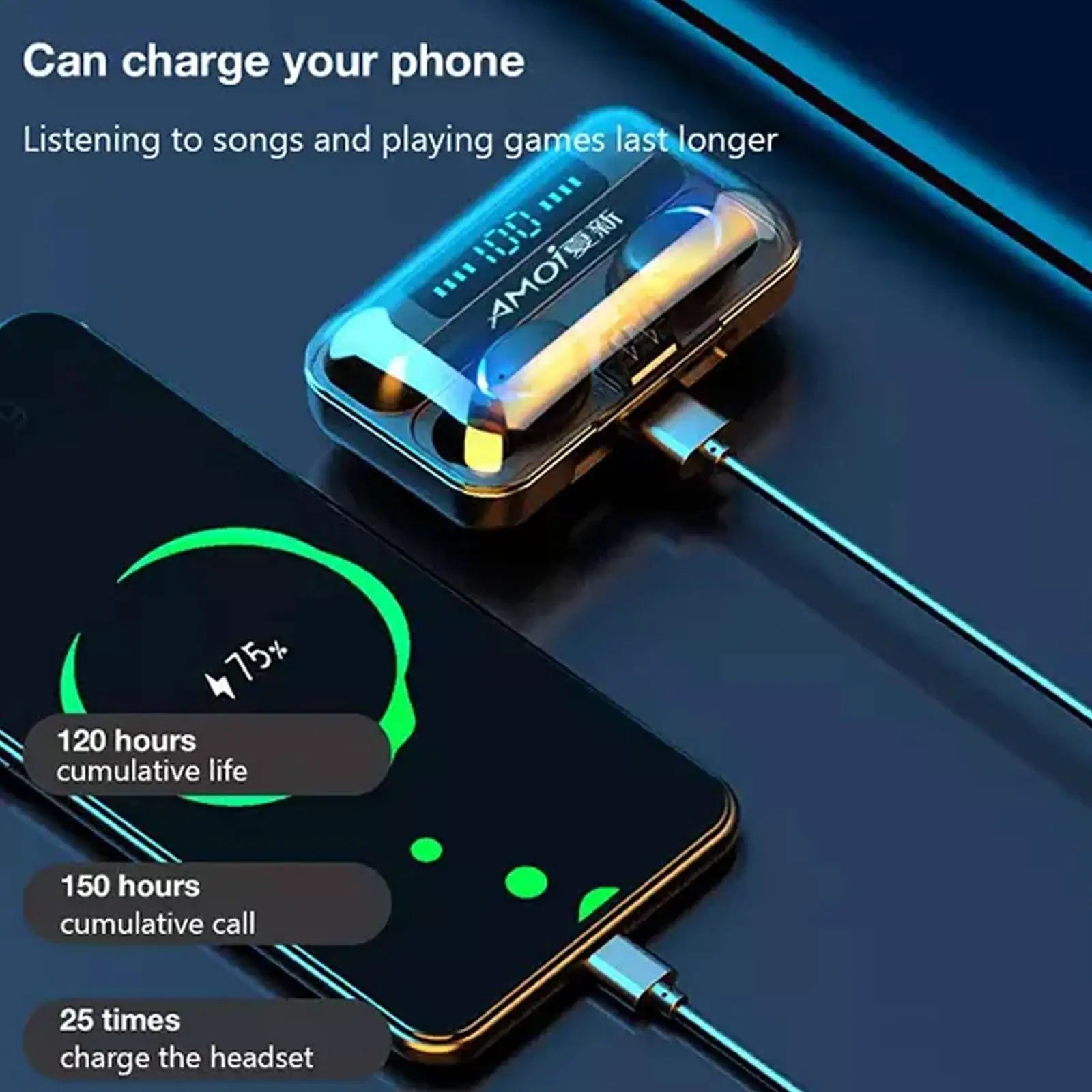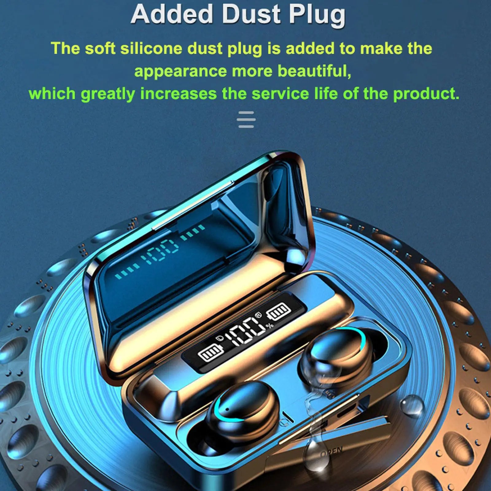 Pantalla de alimentación individual de los auriculares y el estuche de carga. La pantalla LED inteligente muestra cuánta batería queda para la base de carga y ambos auriculares.