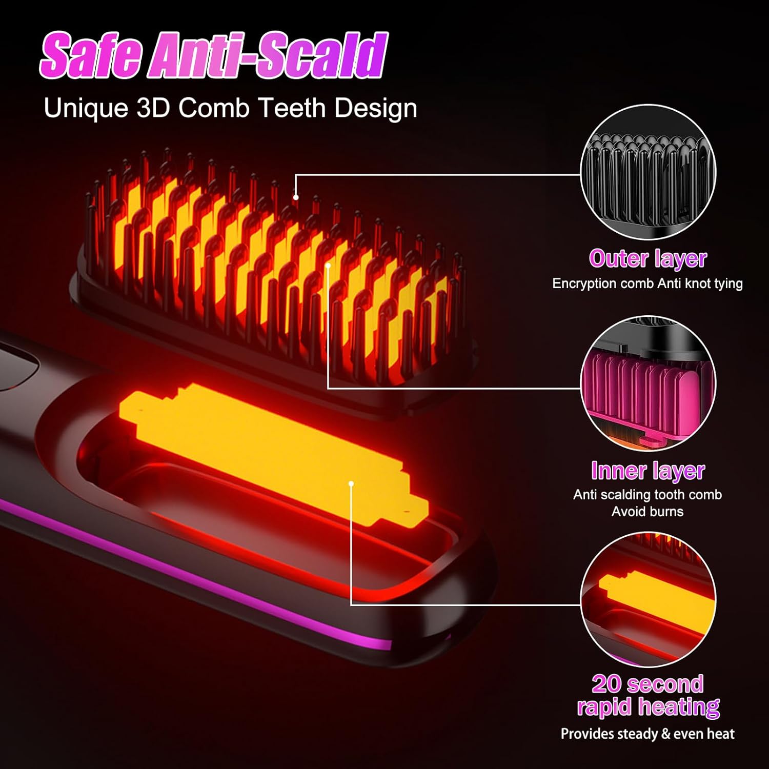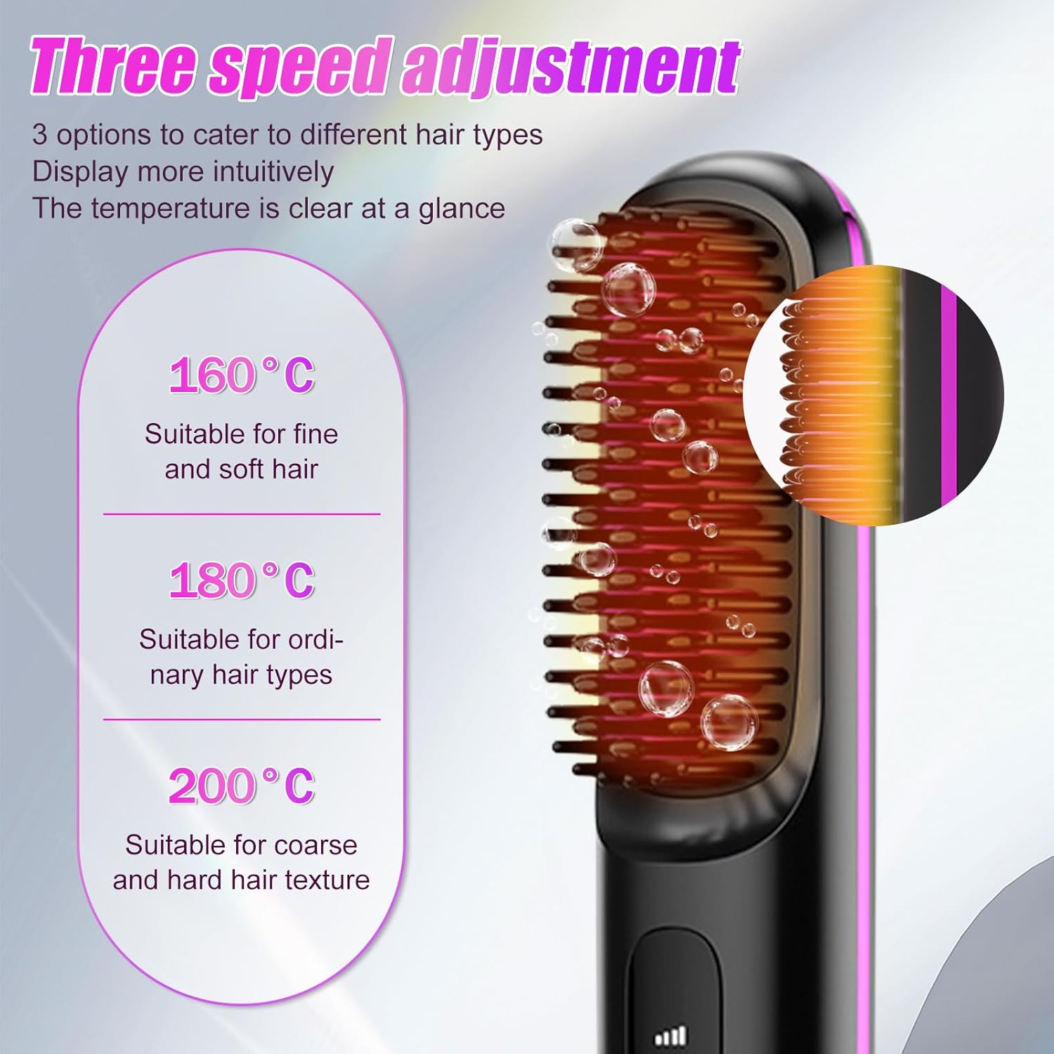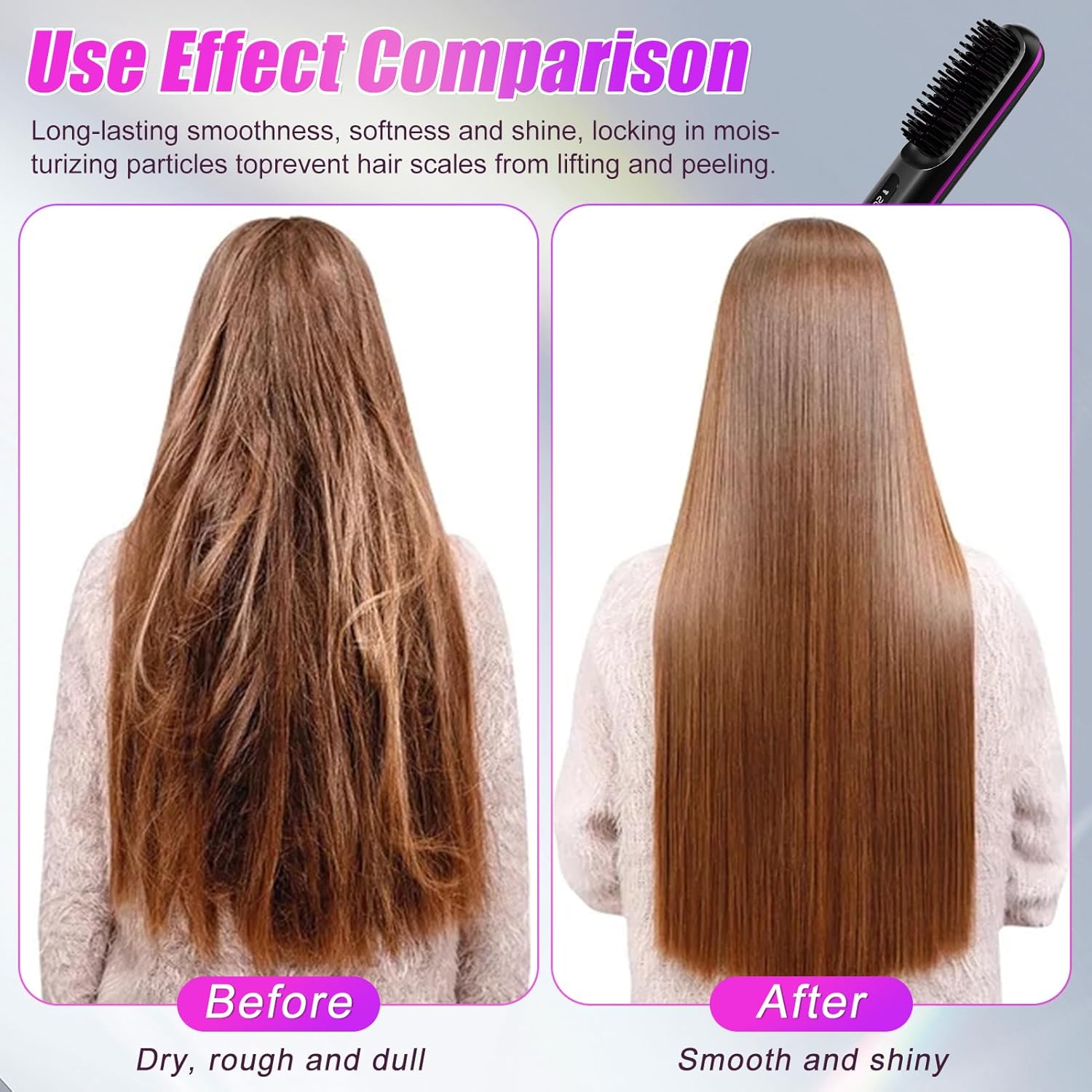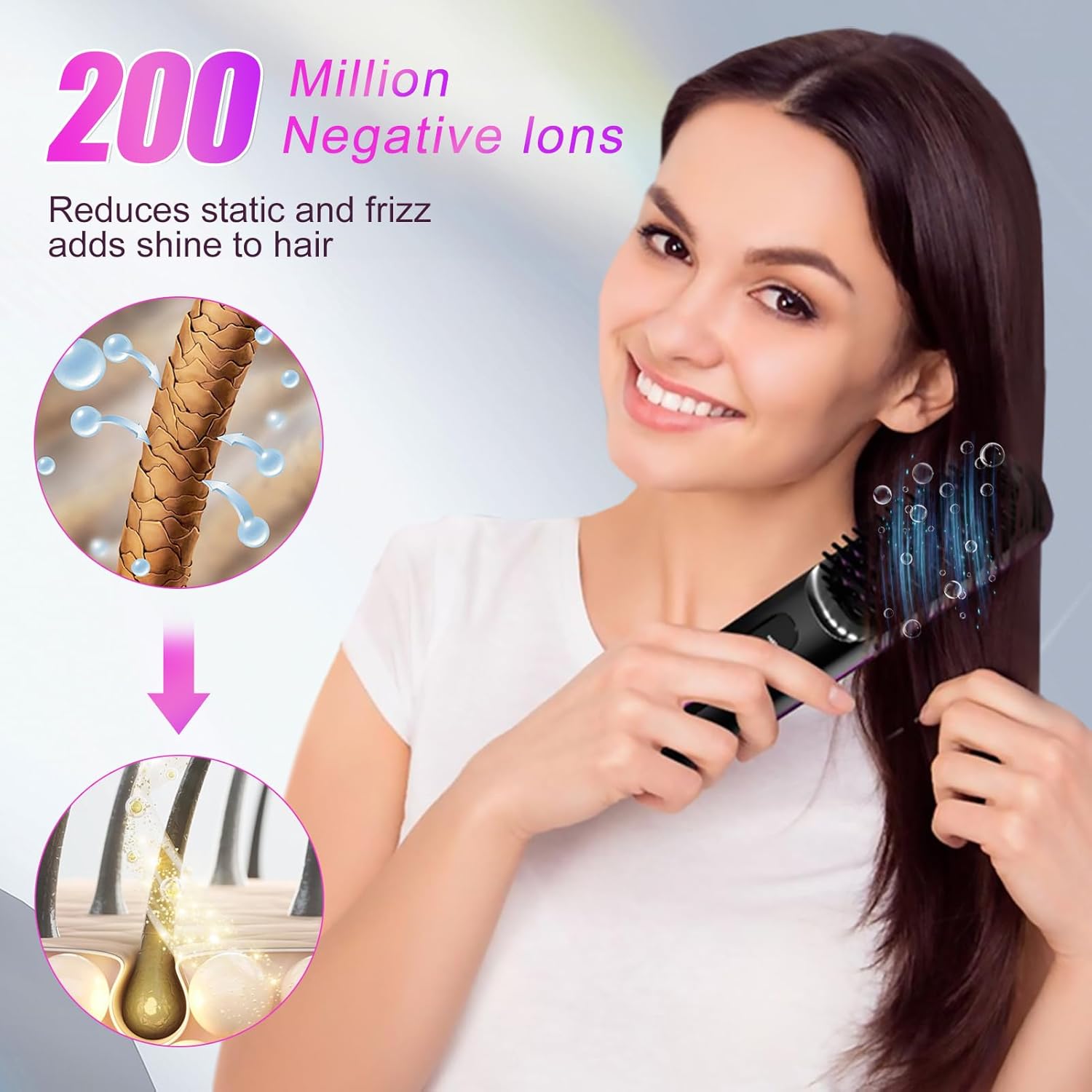 Este cepillo alisador no solo alisa tu cabello, también lo transforma. Durante su uso, libera hasta 20 millones de iones negativos, lo que ayuda a eliminar la electricidad estática y a sellar la cutícula del cabello. El resultado es un cabello visiblemente más suave, brillante y libre de encrespamiento desde la primera pasada. Puedes usarlo todos los días para mantener un look pulido o llevarlo contigo para dar un retoque rápido en cualquier momento. Disfruta de un alisado profesional y saludable donde estés.