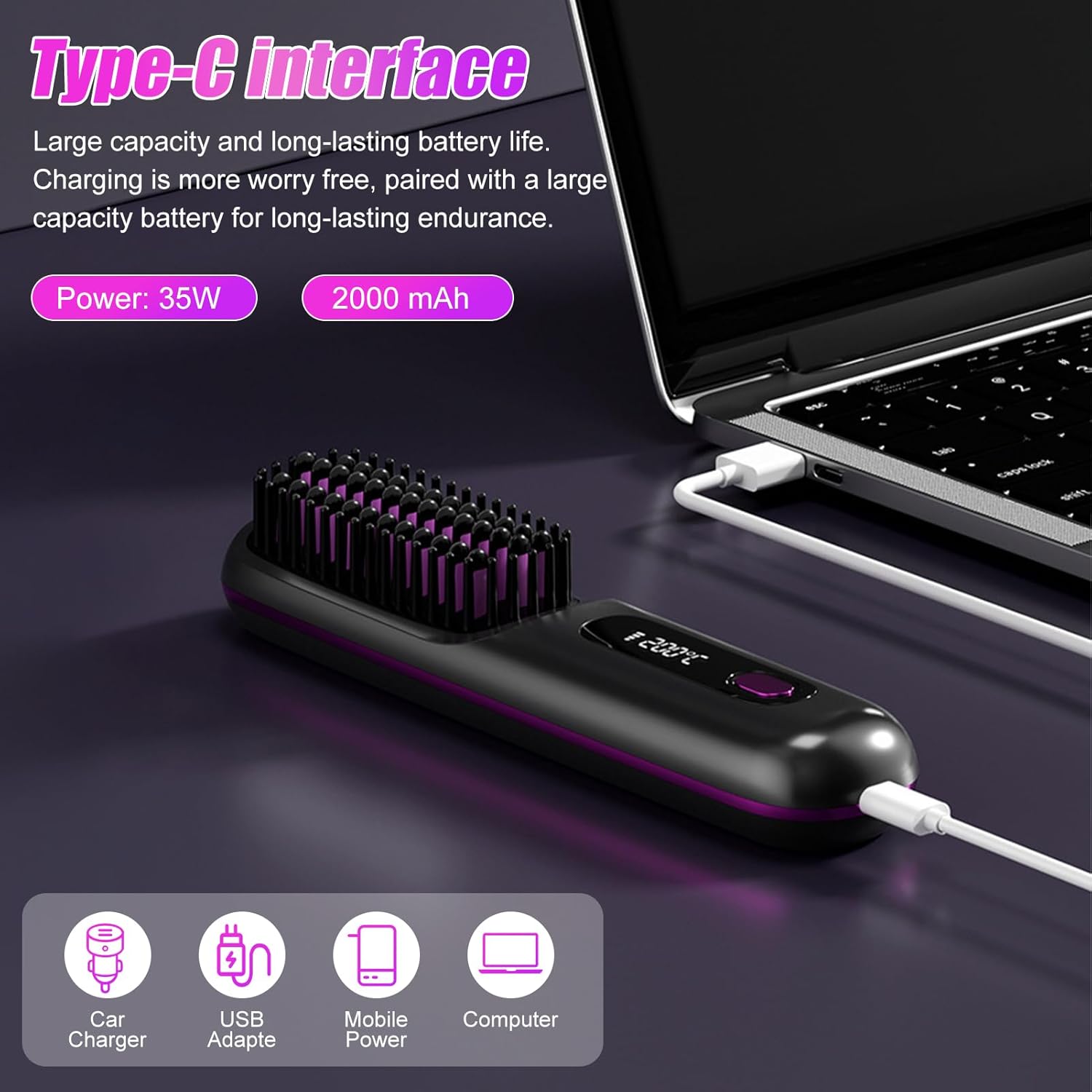 Gracias a su batería de 2000 mAh, este cepillo inalámbrico ofrece entre 30 y 40 minutos de uso continuo con una sola carga. Eso es más que suficiente para un alisado completo o varios retoques a lo largo del día. Incluye una pantalla LCD que te permite controlar y ajustar la temperatura fácilmente, según tu tipo de cabello. Con sus 3 niveles de temperatura, es ideal tanto para cabello fino como para cabello grueso y rizado (en estos casos, se recomienda repetir el proceso un par de veces para obtener mejores resultados). Eficiencia, potencia y tecnología en la palma de tu mano.