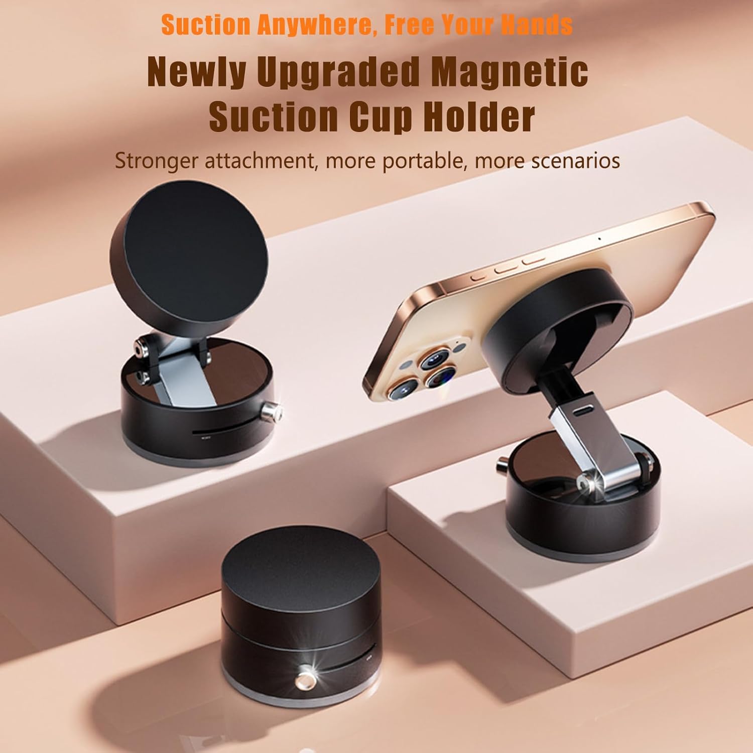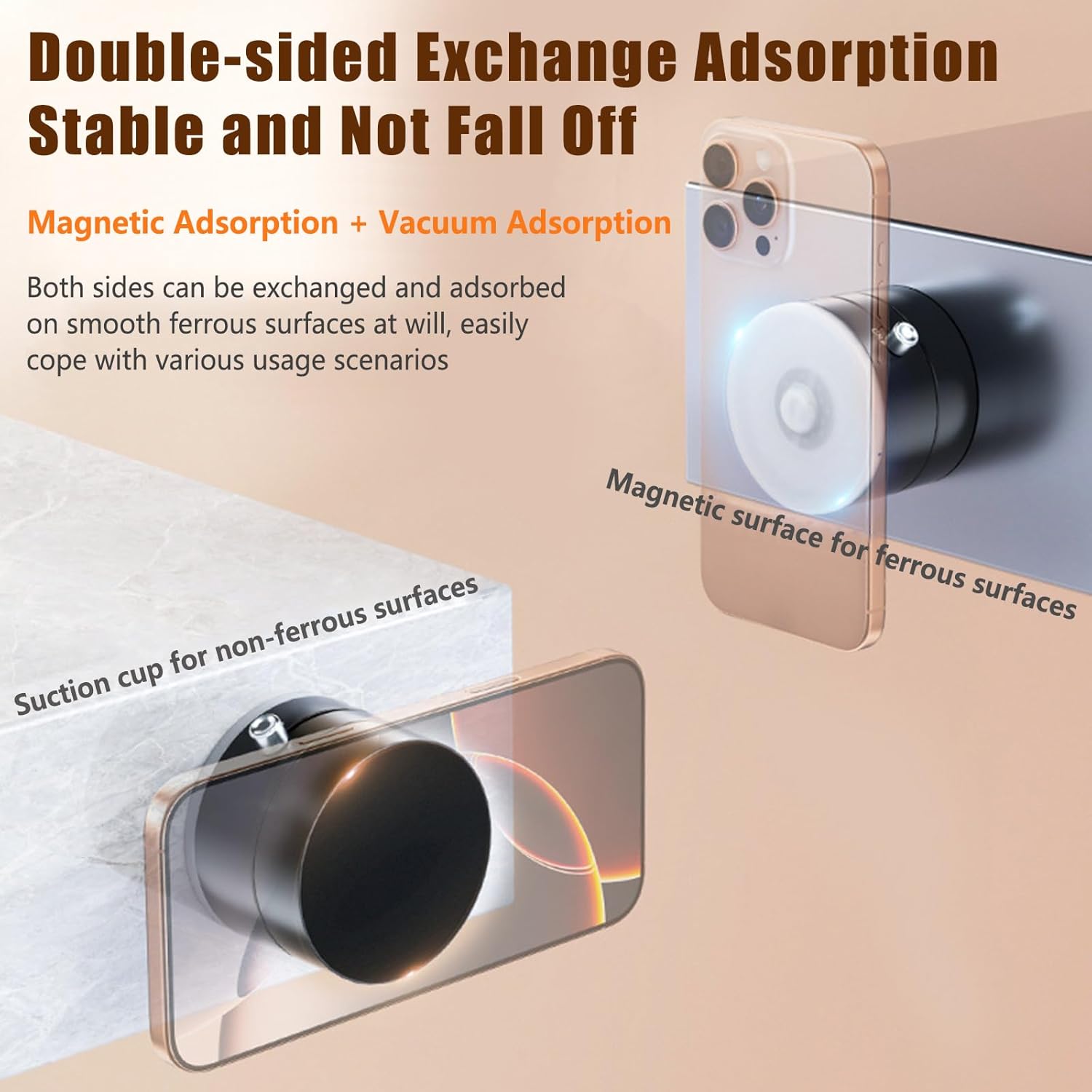 Nuestro soporte magnético al vacío está diseñado para ser compatible con una amplia gama de marcas y modelos de teléfonos inteligentes. Incluye un anillo metálico magnético adicional para los teléfonos que no cuentan con imán o para aquellos que utilizan fundas gruesas, asegurando una sujeción firme y estable combinando la tecnología de vacío inteligente y la fuerza magnética.