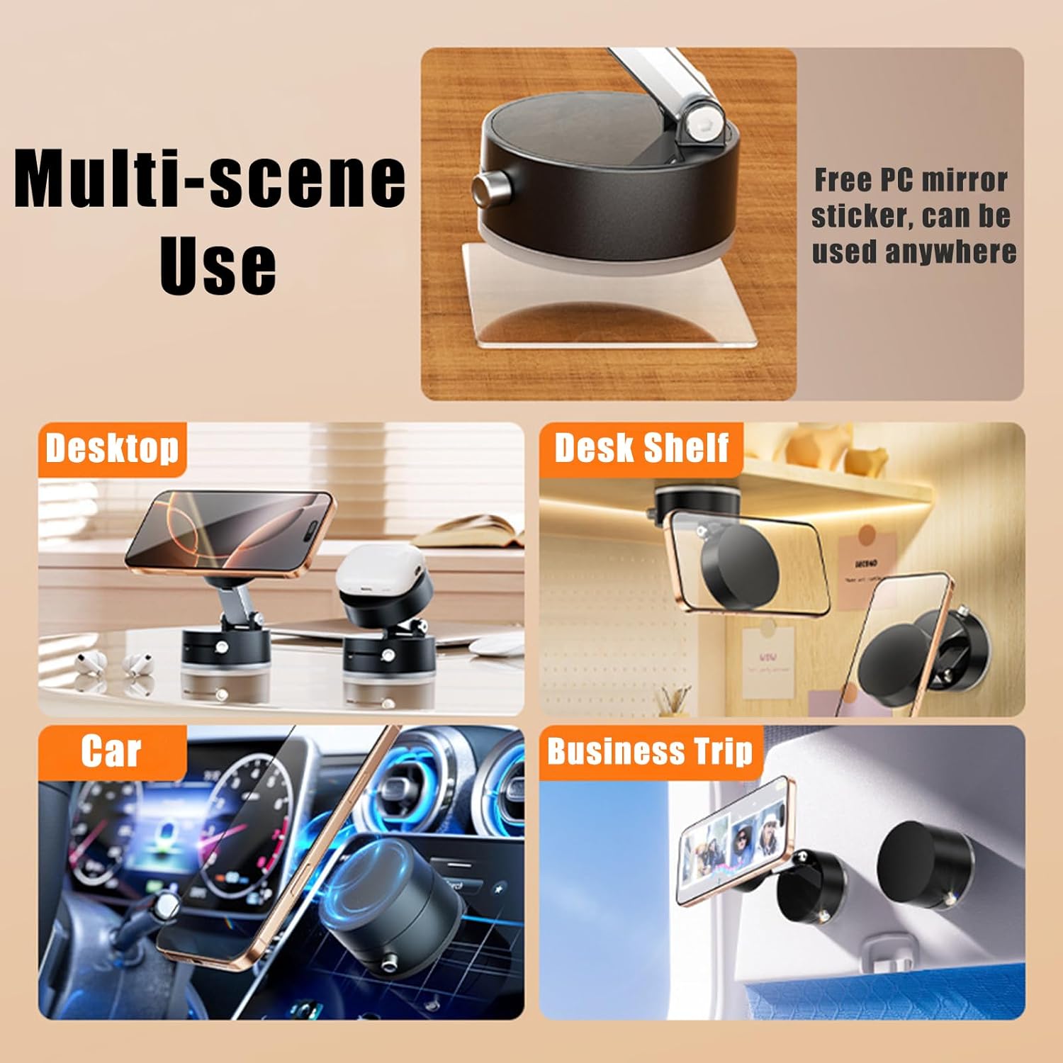 A diferencia de los soportes tradicionales que solo funcionan en superficies limpias, este soporte cuenta con una base fabricada en TPE de alta elasticidad que se adhiere firmemente incluso sobre superficies sucias o con polvo, sin dejar ningún tipo de marca ni residuo. Esto garantiza una fijación segura y confiable en todo momento, ideal para el uso diario.