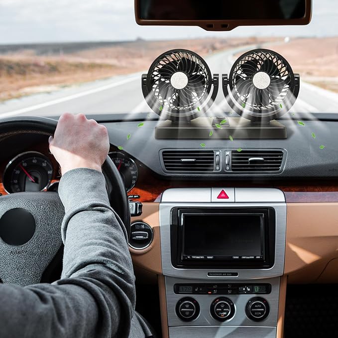 Ventilador para coche de doble cabeza con conexión USB diseñado para proporcionar una ventilación potente y ajustable en ambos lados su doble cabezal giratorio permite dirigir el flujo de aire en diferentes direcciones mejorando la circulación dentro del vehículo ideal para días calurosos y viajes largos su diseño compacto y silencioso garantiza comodidad sin distracciones compatible con la mayoría de coches y fácil de instalar en el tablero o reposacabezas.